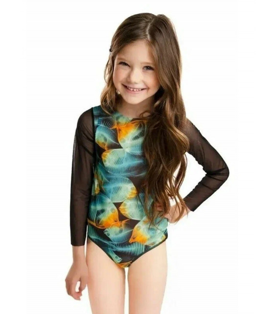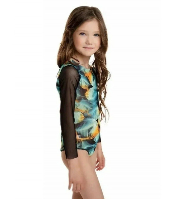 Long sleeve one-piece girls’ swimsuit.